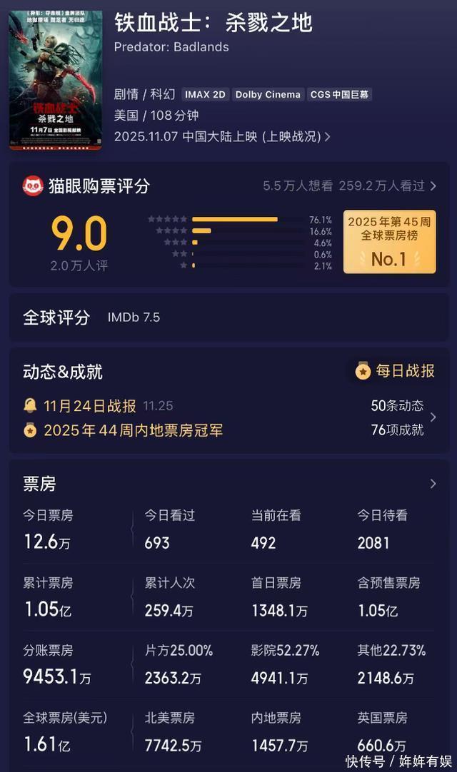 在国内,上映了一周之后,就碰到了巨无霸电影《鬼灭之刃》,不管是热度还是排片,都是压倒性的碾压。 眼瞅着《鬼灭》的冲劲过去了,又来了易烊千玺的《狂野时代》,但这还不是最重要的,这一周超级巨无霸电影《疯狂动物城》来了,更是“灭顶之灾”啊。 后者光是排片就达到了65%,几乎是压倒一片,独占鳌头了,个人预测,《疯狂动物城2》的全球票 房,将会大大超过20亿,也是今年能够闯进前三的种子选手了。 但一切都要建立在口碑质量8分以上的基础上,第一部拿下9.3分,第二部的成绩,怎么着也得8.5分吧。 而在差不多时间的电影,就相当吃亏了。 你看《铁血战士》了吗,觉得怎么样呢。