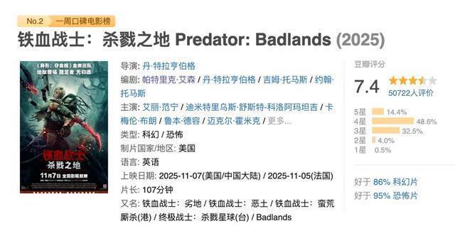 但有一些电影,也许就没有这么幸运了,比如今天要说的主角《铁血战士》。 《铁血战士》的口碑算是最近相当不错的了,比《惊天魔盗团》要好不少,电影不到两个小时的时候,全程高能,大家看得相当过瘾,是比较优秀的爆米花电影。 电影除了制作之外,还设置了不少科幻新元素,比如女主的 分身等等,相当新奇。 在豆瓣上,该片的口碑上了7.4分,在烂番茄上,新鲜度更是高达了89%, 不光是观众们很喜欢,就连专业人士和影评人都赞赏有加。